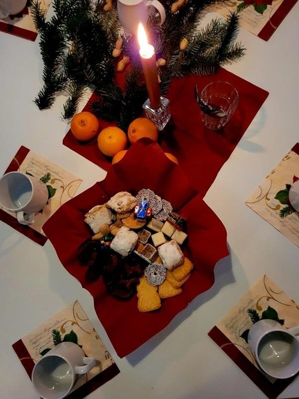 Leckere Süßigkeiten und ein wenig gesundes Obst, die bereitgestellten Tassen mit hübschen Servietten nicht zu vergessen. Da werden alle eventuellen Diätpläne vergessen und der Gaumen wird auf Dominostein-Empfang geschaltet, denn die könnten in der Vorweihnachtszeit meine Hauptmahlzeit ersetzen.